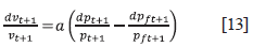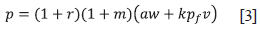 La ecuación [3] es similar a la que presentan Bhaduri y Marglin (1990), pero, a diferencia de su ecuación, en la ecuación [3] aparece la tasa media de ganancia como parte del sobreprecio. En esta ecuación, a es el trabajo por unidad de producto, k son los insumos importados por unidad de producto, tanto a como k se consideran exógenos y constantes. w es el salario, pj es el precio de los insumos importados en moneda extranjera, v es el tipo de cambio nominal. A partir de la ecuación [3] se obtiene: