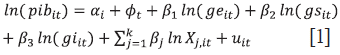 Siendo i el subíndice que indica los individuos (países) y t los periodos de tiempos (años), pib es el logaritmo del PIB per cápita (variable que explica el crecimiento económico), ge, gs, gi es el conjunto de variables que indican el gasto público en materia de educación, salud e investigación, innovación y desarrollo respectivamente, y .Xj,¡t es la matriz de variables que pueden estar correlacionadas con el crecimiento económico (formación bruta de capital fijo y población económicamente activa), u¡t es el error o también conocido como término no observable, au es la heterogeneidad no observable de los individuos (países), Φt contiene la heterogeneidad no observada en el tiempo y por último , que representa los estimadores.