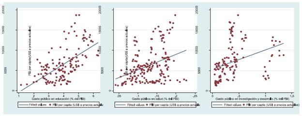 En la Figura 1 se muestra un diagrama de dispersión entre el PIB per cápita y los niveles de gasto público destinados al sector de la educación, salud y al área de investigación y desarrollo para los países suramericanos durante el periodo 1995-2018. Los datos analizados evidencian una posible relación positiva entre los recursos destinados a los distintos sectores de la economía y el PIB per cápita de los países latinoamericanos, es decir, mayores niveles de gasto público pueden estar correlacionados con elevados niveles de crecimiento económico.