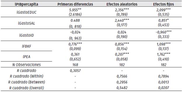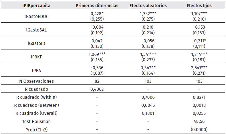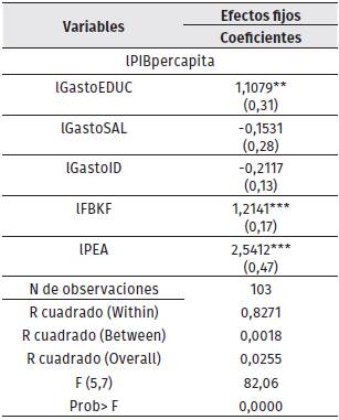 Dado lo anterior, se analizan los coeficientes obtenidos en el modelo de efectos fijos. Como se puede observar, un incremento del 1 % adicional en el porcentaje de participación del gasto en educación aumenta 1.11 % el producto interno bruto por habitante; resultado que concuerda con Gómez y Zárate (2011), que al estudiar 11 países latinoamericanos durante un periodo de 10 años (1999-2008), muestran que un incremento en el gasto público en educación genera un efecto positivo en los agregados económicos (PIB). En cuanto al gasto en salud, no existe suficiente evidencia empírica y estadística para afirmar que tiene una relación con el componente macroeconómico en cuestión, lo que se puede evidenciar en el bajo nivel de recursos destinados a este sector de la economía. Similar a lo obtenido por Bravo (2013) para la economía mexicana, en donde demuestra que un aumento en el gasto en salud genera un efecto positivo en el crecimiento económico; sin embargo, no es significativo. Con relación al gasto público en investigación, este tiene un efecto negativo con respecto al crecimiento económico, ya que un 1 % adicional en el porcentaje destinado a este rubro disminuye en 0.21 % el PIB per cápita. Esta situación ha sido analizada por varios autores, como es el caso de Pardo (2018), quien afirma que este resultado se debe a que los niveles de inversión en este sector por parte de los países en vías de desarrollo son relativamente bajos o han venido disminuyendo con el tiempo; por ello, resalta la importancia de aumentar los recursos destinados a este sector, dado que invertir en el área investigación fortalece la industria nacional, incentiva la innovación y, por ende, mejora la productividad de un país.