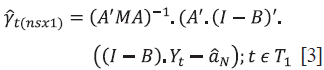 Donde T1 es el período postratamiento. En [3] se asume que la matriz A'MA es no singular (i.e., posee inversa) y que en el período de postratamiento la matriz de los spillovers A no cambia en el período postratamiento15. El primer supuesto es la condición de invertibilidad de Cao y Dowd (2019). También de [3] y de [2] se obtiene que los estimadores
