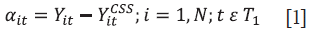 Donde Ycssit es la variable-resultado sintética o contrafactual, la cual incluye una estructura conocida de spillovers, tanto para la unidad de tratamiento (i=1, o α1t) como para las unidades de control (i ≠ 1).
