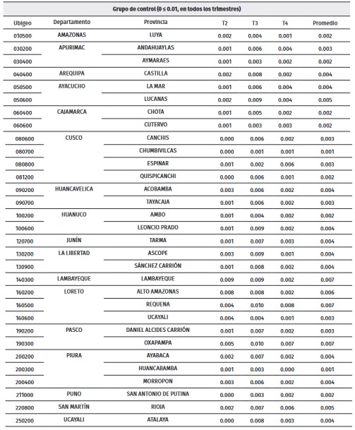 i) Dada la división de las 90 provincias del Perú entre las 59 tratadas y 31 de control, las cifras de la Tabla 3 indican que la diferencia del promedio de parámetro umbral, θ, entre las provincias de control y tratadas es significativa. Así, el umbral promedio de las provincias de control representa solo el 30 % del umbral promedio de las provincias tratadas. Adicionalmente, el valor mínimo del umbral promedio (trimestral) de las provincias de control representa solo el 20 % del respectivo mínimo de las provincias tratadas. Esto significa que la diferencia entre variable resultado Yt correspondiente a las provincias tratadas con altas tasas de diagnosticados con COVID-19, y la variable resultado sintética con spillovers, Y¡tscs, de bajas tasas de diagnosticados con COVID-19, mide el efecto del diferencial de diagnosticados con COVID-19 de las provincias tratadas, si estas tuvieran bajas tasas de diagnosticados con COVID-19; y, alternativamente, por las bajas tasas del grupo de control que la diferencia de la variable y la correspondiente variable sintética mide el efecto del COVID-19 y las políticas que se implementa-ron por el virus.
