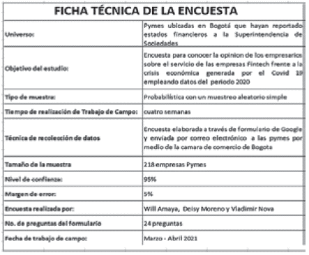 El trabajo de campo se ejecutó en cuatro semanas mediante la aplicación de la encuesta, la cual fue dirigida a un grupo de empresarios de pymes ubicadas en Bogotá con el propósito de validar las diversas oportunidades que tienen las fintech como modelo de prestación de servicios financieros desde varios aspectos como el tecnológico, la innovación, el manejo de tiempos, costos y facilidad en acceso a financiamiento e inversión, entre otros aspectos analizados en el instrumento.