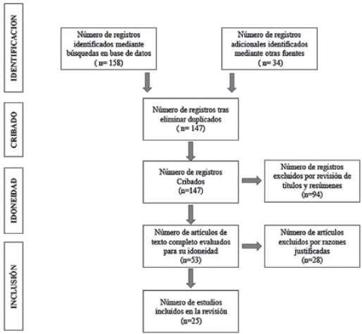 La investigación se realizó con un alcance exploratorio y descriptivo con enfoque triangular de tipo cualitativo y cuantitativo, consistió en un análisis por medio de una revisión sistemática de literatura (SLR) donde se utilizaron las directrices del protocolo PRISMA, el cual pretende garantizar que los artículos incluidos sean expuestos de forma clara y según criterios de selección. Para la revisión sistemática se llevó a cabo la búsqueda en bases de datos académicas como Google Scholar, Proquest, Dialnet, Science Direct y Scopus, donde se combinaron diversos términos como fintech, pymes, oportunidades financieras, servicios, digitalización, COVID-19, tomando como criterio aportes teóricos y metodológicos desde varios autores. Se construyeron fichas de trabajo y se sistematizó la información respecto a las secciones por incluir de los artículos revisados, junto con un diagrama de flujo que explica el proceso de selección (ver Figura 1).