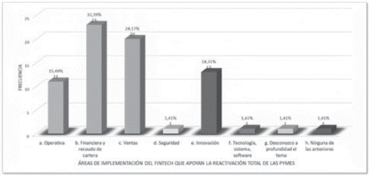 Todas las áreas de la empresa requieren ser apoyadas por las fintech, las cuales pueden desarrollar servicios idóneos que proyecten su mejora continua. En las opciones fueron seleccionadas con un 32.39 % las cobranzas, con un 28.17 % las ventas, con un 18.31 % innovar y con un 15.49 % operativa.