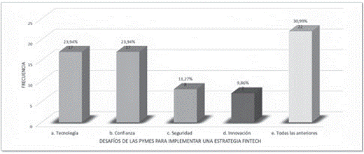 Las empresas opinan en un 23.94 % que los mayores desafíos se encuentran en la tecnología y la confianza en igual porcentaje, otro aspecto por tener en cuenta es que solo el 28 % de las empresas encuestadas conocen las fintech, lo cual hace que se requiera una aprobación del proyecto de ley 413, el cual tiene como fin aumentar la inclusión financiera, así como una oferta de servicios dirigidas a atender las pymes y sus necesidades de tecnologías financieras.