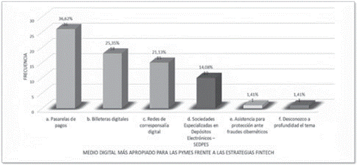 En la Figura 12 se muestra que el medio más apropiado para las empresas frente a las estrategias fintech es la pasarela de pagos, con un 36.62 %; le siguen con un 25.35 % las billeteras digitales, y luego, con un 21.13 %, las redes de corresponsalía digital.