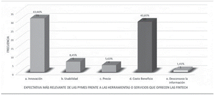 Dentro de las alternativas de servicios financieros que ofrecen las fintech está el crédito digital -con un 40.84 %-, así como los pagos digitales y las finanzas empresariales, ambas con un 23.94 % cada una. Es relevante, de acuerdo con los resultados obtenidos, divulgar e incentivar el uso de las diversas alternativas de servicios financieros cuya demanda es mínima y existe la probabilidad de que sea por desconocimiento o innovación dentro de los procesos de las pymes, entre otros aspectos.