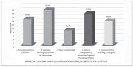 Los resultados revelan que el 86 % de las empresas responden que sí usarían los servicios financieros ofrecidos por el modelo de negocio fintech, a través de tecnología innovadora, ágil y accesible. Esto resulta favorecedor para incentivar el acceso a los servicios, pues existe un mercado cuyas necesidades de capital y de inversión buscan oportunidad de proyección.