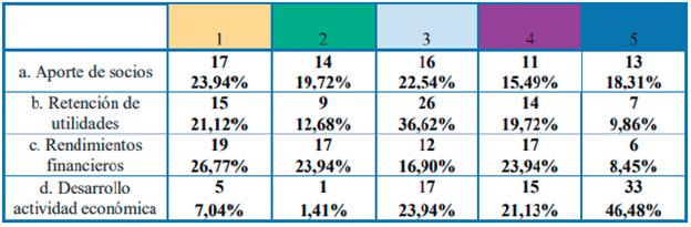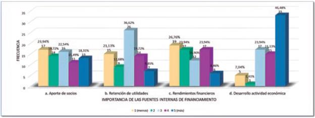 El desarrollo de la actividad es la fuente de financiación interna más relevante para las empresas encuesta-das -representa un 46.48 %-, lo cual permite entrever que las fintech pueden ser un mecanismo de financiamiento alternativo, ya que frente a nuevas estrategias empresariales y a negocios estacionarios que requieren capital para comprar, los nuevos servicios abren paso a una financiación alternativa que reduzca la excesiva dependencia del crédito bancario y cree caminos competitivos que aumenten sus utilidades y alivien sus pasivos.
