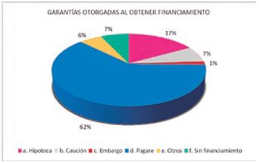Los resultados muestran que las entidades cuentan con los pagarés como garantía al obtener financiamiento, con un 62 %. Este es producto del financiamiento a corto plazo, destinado a obtener capital de trabajo, pagos a proveedores, adquisición de inventario, luego de establecer la obligación de pago en cuotas, más el interés - correspondiente.