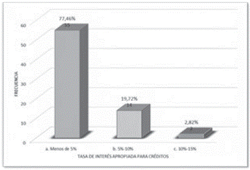 Lo apropiado para un 77.46 % de las empresas es una tasa de interés menor del 5 % TEA; le sigue la tasa entre 5 % y 10 % con un 19.72 %. Esto ha disuadido a las entidades de recurrir a esta opción de financiamiento por las altas tasas de interés que presenta el mercado para los créditos.