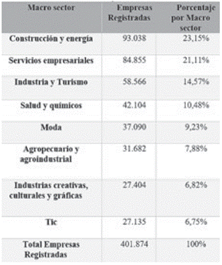Según el Registro Mercantil de la Cámara de Comercio de Bogotá (Cámara de Comercio de Bogotá, 2019) las empresas de Bogotá están clasificadas en los distintos macrosectores, como se muestra en la Tabla 2.