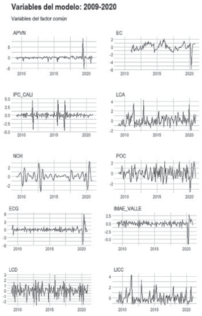 Por tanto, los nombres de las variables (y nombre corto) son: aproximación al precio de la vivienda nueva en Cali (AVPN), estadística de concreto (EC), estadística de cemento gris (ECG), IMAE del Valle del Cauca, índice de precios al consumidor de Cali (IPC), licencias de construcción por área (LCA), licencia de construcción por destinos (LCD), licencias de construcción Cali (LCC), número de créditos hipotecarios (NCH) y personal ocupado de la construcción (POC).