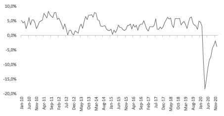 Además, se advierte en el recorrido de la serie un patrón entre 2012 y 2014, pues en 2012 empieza a decrecer hasta 2013, a mediados del 2013 comienza a aumentar, hasta el 2014 que empieza a disminuir. Este comportamiento no vuelve a presentarse en años posteriores. Otro momento relevante del recorrido son los valores en 2020. En marzo y abril se ve una tasa de crecimiento negativa y muy pequeña (por debajo de -0,08), y hacia mayo y junio vuelve a incrementar la dinámica del sector.