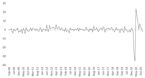 Se destaca que, en el MFD, las variables seleccionadas toman en cuenta el método de componentes principales, luego se aplica el filtro de Kalman (Stock & Watson, 1991). Este filtro indica cuánto contribuye cada variable al comportamiento del indicador mensual (la sumatoria debe ser igual a 1). En la Figura 2 se muestra la trayectoria de la serie en el año 2020, con un comportamiento atípico que registra la caída de la producción del sector.