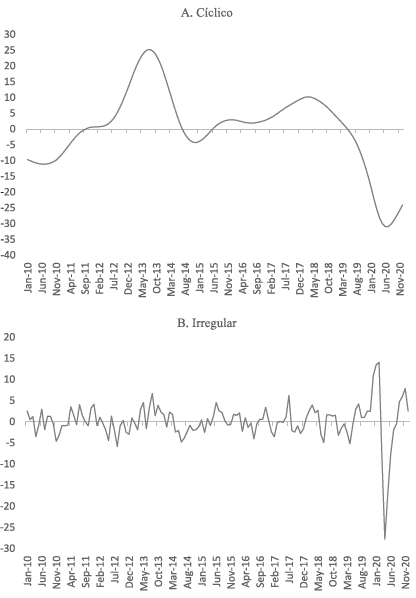 Por otra parte, se destacan las características de las variables respecto a la descomposición de las series sobre la tasa de crecimiento en términos de tendencia, del componente estacional y el componente irregular. Se nota que no tiene una tendencia propia de este tipo de variables, pues aísla el componente estacional y el irregular. En la Figura 4 se aprecia el comportamiento de los componentes cíclico e irregular, donde llama la atención el evento atípico ocurrido en 2020 debido al impacto negativo que tuvo la pandemia COVID-19 sobre el indicador de monitoreo del sector de la construcción.
