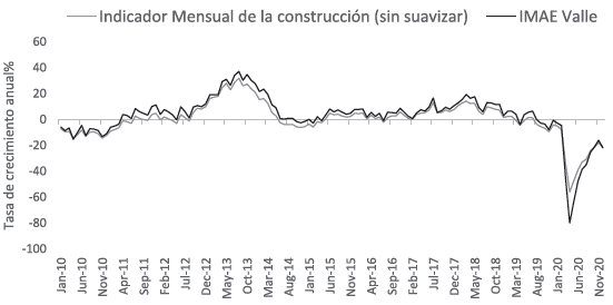 El indicador mensual de la construcción presenta dos períodos marcadamente diferentes: uno en el que alcanza su mayor crecimiento en 2013. Esto coincide con el comportamiento económico de este departamento con el crecimiento de la construcción en el subsector de vivienda y también de obras civiles. Sobre el subsector de obras civiles es relevante la inversión en construcción realizada en la vía Buga-Buenaventura, en la finalización del puerto de Buenaventura. El otro período comienza en 2014 y termina en 2019, con crecimiento moderado, en el que se destacan las edificaciones en Cali en la zona sur en estratos 5 y 6. En infraestructura conviene mencionar la inversión en la construcción de la vía Cali-Jamundí que culminó en 2020.