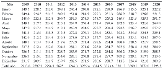 Para la lectura mensual del indicador de la actividad económica de la construcción, se continúa con la desagregación del PIB departamental de periodicidad anual a una mensual. Es similar el caso para el PIB de la actividad económica de la construcción del departamento. En la Tabla 2 se exponen los datos extraídos mediante el método de Litterman (1983). Se consideró el periodo comprendido entre 2009 y 2020. Con la serie del indicador normalizado se estimó la mensualización del PIB del SC. Por tanto, la serie mensual del PIB del sector con el factor dinámico garantiza consistencia en el recorrido de la serie, por el tratamiento de las variables del factor común y también porque el PIB original es a precios constantes.