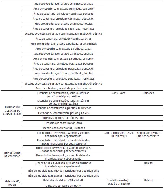Ahora bien, a nivel nacional, el PIB de la construcción es publicado por el DANE de forma anual para todos los departamentos del Estado colombiano, caso DANE (2020a), y el PIB por subsectores del SC se publica por Camacol, con un rezago de cuatro años. Por otra parte, para el Valle del Cauca, el informe del Boletín Económico Regional Valle de Camacol sobre el comportamiento de los niveles de edificaciones de vivienda y créditos hipotecarios tuvo su última publicación en el primer semestre de 2018. Ahora, aunque también se ofrece anualmente un estudio de oferta y demanda de vivienda con algunas estadísticas de edificaciones, estos informes no son de acceso libre, tienen un costo para la consulta. Respecto a la información desagregada, es decir, a indicadores o índices del departamento del Valle del Cauca, no se cuenta con una publicación mensual o trimestral para el SC que permita la consulta oportuna de dichos datos.