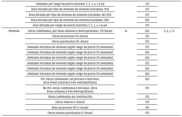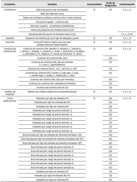 Para la selección de variables se tomaron en cuenta una a una las correlaciones como criterio cumplido y también la importancia económica de cada una. Los criterios para la selección de las variables que conformaron el indicador son: importancia económica (IE), correlación positiva con el PIB del SC (CPIB), y correlación positiva con el IMAE del Valle (CI). Después, se preseleccionaron 28 variables: 10 corresponden a vivienda, 6 al censo edificaciones, 7 de la economía del Valle, 5 a licencias de construcción3 y una a créditos hipotecarios. En la Tabla B del Apéndice se muestran las transformaciones según los criterios.