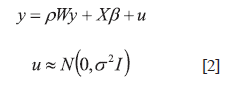 In equation (1) it can be observed that if spatial lag is omitted in exogenous or endogenous variables, the feature of spatial dependence will be transmitted to the error term, in the case quoted as substantive spatial autocorrelation. In facing this situation, it is necessary to include the spatial lag of the variable within the spatial autocorrelation.
