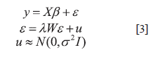 In equation 3, if there is no omission of the lag in the variables of the model, it corresponds to the case spatial autocorrelation of the residuals, and then a scheme of spatial dependence in the error term must be included (Moreno & Vayá, 2002). In the implementation of the spatial error model, we assume that there is an autoregressive process in the error terms, and we assume that there is some kind of spillover effect on the residuals.