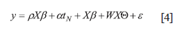 where Y is an n x 1 vector of observations of the dependent variable associated with each spatial unit (k=1,..., N), l N corresponds to an n x 1 vector of ones associated with constant parameters α, X α n x K matrix representing exogenous variables with the set of associated parameters ß and β as an independent and identically distributed error term for all i, with zero mean and variance σ2.