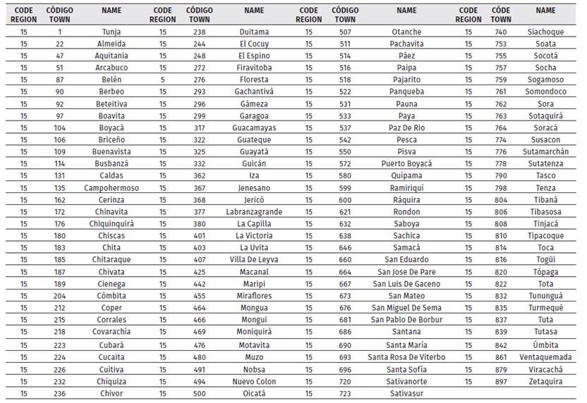 The 123 municipalities that make up the department of Boyacá are assumed the primary spatial unit of the analysis. The existing production and demographic information are duly attributed to each municipality, and the level of detail is sufficiently specific to undertake a spatial analysis, and to specify the econometric model. The spatial approach is the driving force of the analysis because we expect that geographical proximity determines common production and rural characteristics across geographical units.
