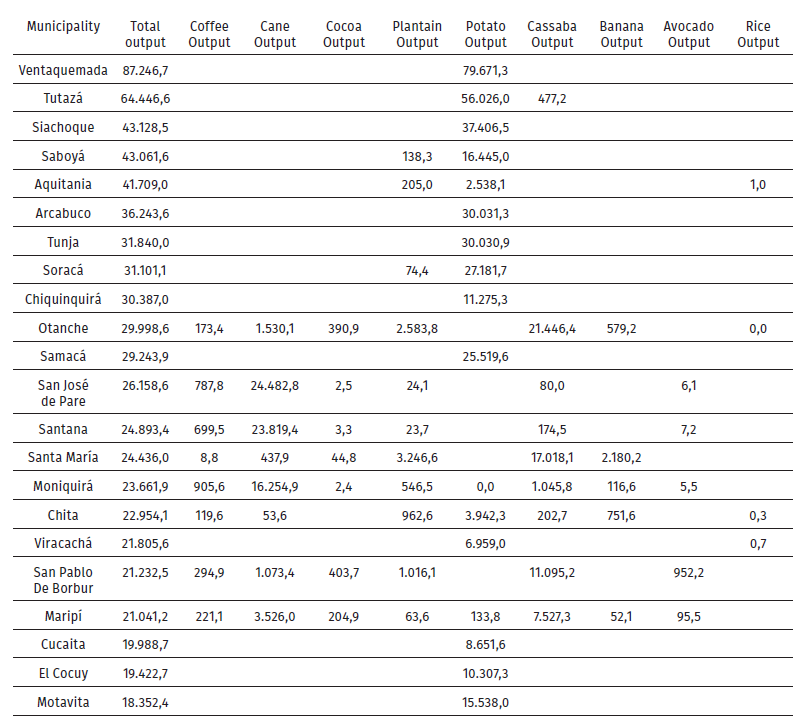 The content of this article is divided into three parts. The first part presents a rough outline of the general conditions that are common to rural exploitation in Boyacá. The second part describes the production profile, considering the individual relevance of the 123 municipalities according to the production reported by the Census of Agriculture. The following empirical section forms the core of the article, combining a spatial description of the agricultural production and a model run of spatial econometrics Finally, the last section concludes the analysis. The contribution of the article lies in the use of census information and the empirical application to Boyacá. It is hard to find this kind of research elsewhere, using the comprehensive baseline data provided by the Census of Agriculture.