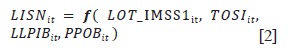 LISNit = natural logarithm of ISN for federal entity i during period t in pesos. The ISN is collected by employers based on labor transactions arising from employee service provision (Suprema Corte de Justicia de la Nación [SCJN], 2012; INEGI, 2022c).