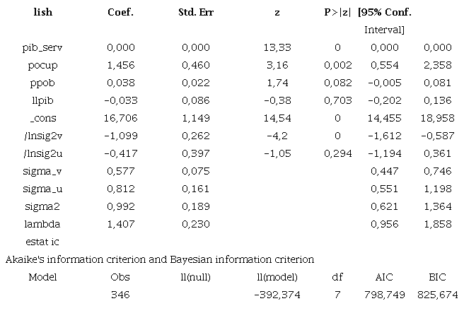 frontier lish pib_serv pocup ppob llpib, distribution(tnormal)