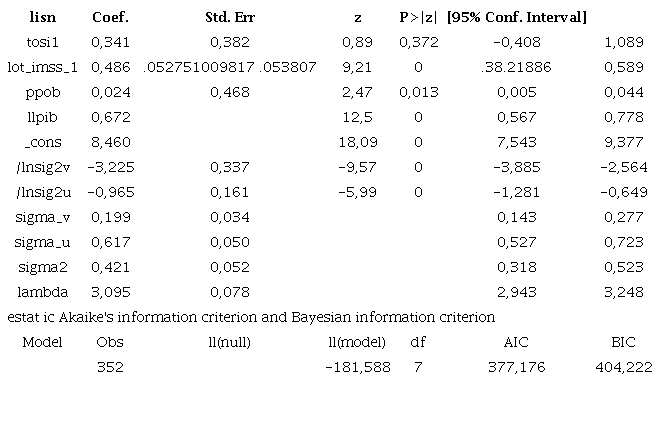 frontier lisn tosi1 lot_imss_1 ppob llpib, distribution(hnormal)