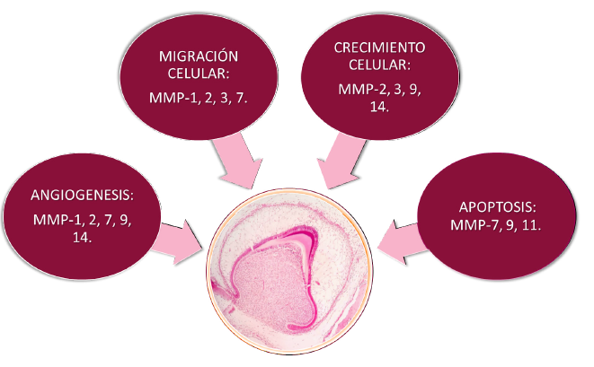 Relación de las Metaloproteinasas con la Odontogenesis. Observamos la influencia de las MMP en el desarrollo dentario, encontrando a MMP-2 o MMP-9 involucrados en todas las etapas