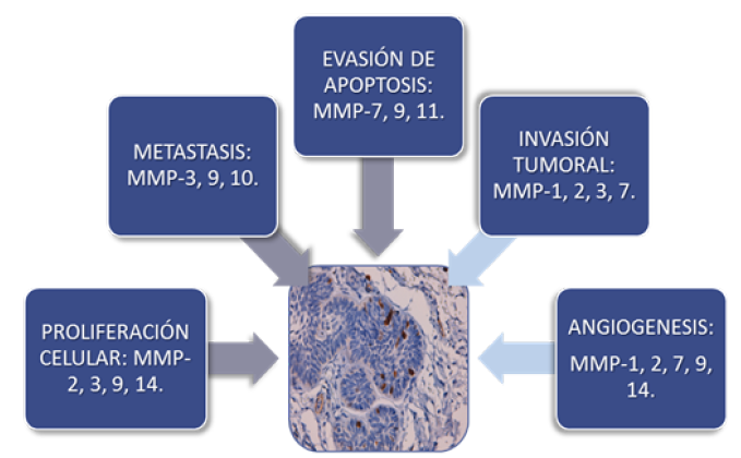 Las MMPs son las principales mediadoras en las alteraciones observadas en el microambiente tumoral durante la progresión del cáncer. En el crecimiento tumoral juegan un papel fundamental en la degradación del tejido conectivo y los componentes de la membrana basal, además de activar factores de crecimiento, receptores de superficie para moléculas de adhesión y quimiocinas. Esta interacción altera la respuesta celular, lo que permite que las células tumorales se tornen menos adherentes y por lo tanto con más posibilidades de migrar y producir metástasis. Las MMPs pueden jugar distintos papeles durante la progresión del cáncer, dependiendo del estadio del tumor (Fig. 2).