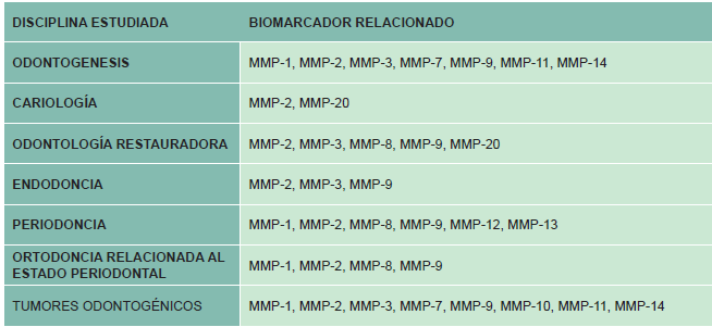 Se concluye que, MMPs-2 y MMPs-9 actúan en todos los procesos patológicos anteriormente nombrados, durante el desarrollo del germen dental así como su influencia en la proliferación e invasión de los tumores odontogénicos, su participación en la degradación de los tejidos dentarios y periodontales promoviendo la instalación de la lesión cariosa, gingivitis y periodontitis; confirmando que esta familia de proteínas puede llegar a jugar un rol preponderante dentro de diversos procesos biológicos bucales. A su vez a lo anteriormente dicho, hace que las MMPs actualmente sean consideradas biomarcadores de importancia para la investigación en las diferentes áreas de la odontología.