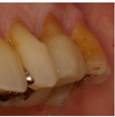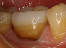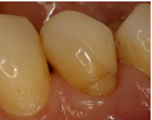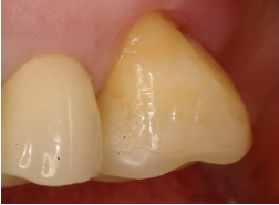 EC en #36 después de 18 años (IPS-Empress). Obsérvense las facetas de desgaste parafuncionales, la recesión gingival y la lesión cervical no-cariosa. Esta paciente se negó a usar placa de estabilización nocturna.