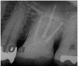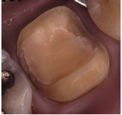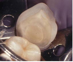 Las paredes internas de la corona dentaria y de la cámara pulpar, deben tener una divergencia hacia oclusal mayor de 60 y si presentan depresiones o zonas retentivas, deben rellenarse con cemento de ionómero de vidrio. El operador, dispensa una fina capa del mismo cemento en el piso cameral. En este estudio cuatro preparaciones tenían 3 paredes coronarias (Figs. 1b, 2a), cuadro 2 paredes (Fig. 3a) y en 2, las restauraciones abarcaban 4 paredes coronarias.