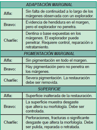 Adaptación Marginal, Pigmentación Marginal y Superficie, fueron las variables estudiadas para establecer la calidad de las restauraciones, siguiendo el criterio de Ryge, (16) modificado por los autores (Tabla 1).
