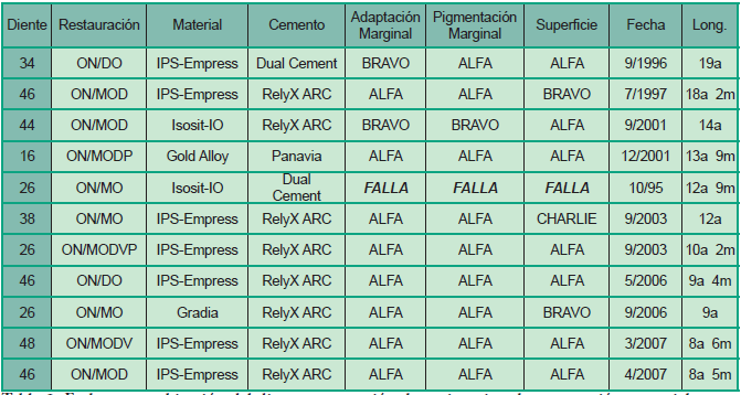 Las variables evaluadas fueron: edad, género, período de asistencia al consultorio, preparación dentaria, material restaurador, cemento resinoso, calidad y longevidad de las restauraciones, hábitos parafuncionales, distribución en las arcadas dentarias, recidiva de caries y terapia de mantenimiento.
