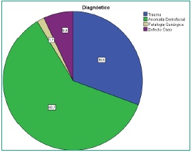 El análisis por diagnóstico presuntivo, mostró mayor frecuencia de imágenes compatibles con anomalía dentofacial 105 (60,7 %) que compatibles con trauma 53 (30,6 %) (p=0,00000002). Con respecto a las imágenes asociadas a impresión diagnóstica de trauma (fig 2), 32 (60,4 %) corresponden al género masculino y 21 (39,6 %) al femenino (p=0,0003). Se calculó una relación de riesgo (Odds Ratio) de 3,42 para los hombres. El grupo de edad entre 21 y 30 años presentó mayor cantidad de trauma con 21 radiografías (39,6 %) y el de menor cantidad fue entre los de 51 y 60 años con 3 pacientes (5,6 %). La distribución anatómica del trauma se resume en la tabla 2.