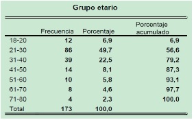 Se encontraron 173 (1,7 %) radiografías con hallazgos sugerentes de la presencia de material de osteosíntesis. La edad media de este grupo de pacientes fue de 33.8 años, 104 (60,1 %) mujeres y 69 (39,9 %) hombres (p=0,5). El grupo entre 21 y 30 años presentó mayor presencia de material con 86 radiografías (48,7 %), mientras que en el grupo entre 71 y 80 años se encontró 2,3 % (4) pacientes; la Tabla 1 resume la distribución por edades de las 173 radiografías