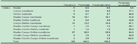 Con impresión diagnóstica de anomalía dentofacial (fig. 3), 30 fueron hombres (28,5 %) y 75 mujeres (71,4 %) (p=0,0002) con un OR de 3,36 para las mujeres. La mayor corrección quirúrgica de anomalías dentofaciales se presentó en el grupo de edades de 21 y 30 años con 40 pacientes (53,3 %) y la de menor fue entre 61 y 70 años con 1 paciente (1,3 %) y 50 radiografías (47,6 %) presentaban ortodoncia. Se identificaron 8 radiografías (7,6 %) con anclajes condilares y el 58 % de las radiografías presentaron evidencia de cirugía bimaxilar. La distribución de la ubicación anatómica del material de osteosíntesis en hallazgos de ADF se presenta en la Tabla 3.
