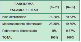 En la distribución de acuerdo al diagnóstico histológico y gradificación por grupos, tenemos que en el primer grupo de los 21 casos de CCECB 16 fueron bien diferenciados, 5 moderadamente diferenciados y no se reportaron pobremente diferenciados. En el segundo grupo de los 96 casos de CCECB 68 fueron bien diferenciados, 19 moderadamente diferenciados y 9 pobremente diferenciados.
