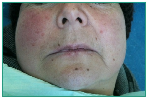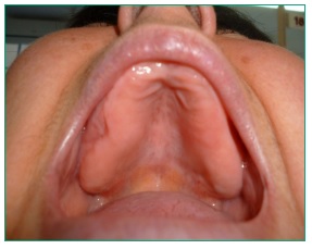 Caso clínico. Paciente de 68 años, sexo femenino que consulta en el Servicio de Urgencia de la Facultad de Odontología, Udelar, por tumefacción en zona geniana alta derecha y dolor moderado. Se realiza drenaje intraoral en la zona vestibular a la altura de la pieza dentaria 13 y se indica medicación antibiótica (Amoxicilina 875 mg. cada 8 hs.). La paciente es derivada a la Clínica Quirúrgica Bucomaxilofacial III presentando persistencia de la tumefacción pero sin dolor. Como antecedentes médicos la paciente es hipertensa controlada pero no compensada y con hipercolesterolemia. Es portadora de prótesis completa superior e inferior. Al examen clínico facial se observa deformación del lado derecho de la cara con borramiento del surco naso geniano (Fig.1). Al examen intraoral, en la zona del cuadrante superior derecho presenta ambas corticales deformadas por vestibular, abarcando desde la pieza dentaria 12 hasta la 16 que se extiende hasta el fondo de surco, coincidiendo con el flanco interno derecho de la prótesis superior, realizada hace veinte meses. Cabe destacar que la mucosa que recubre la zona y el reborde son de características normales en cuanto al color y libre de lesiones (Fig. 2). A la palpación, la deformación se presenta dura y firme tanto por vestibular como por palatino. En dicha maniobra se constata un pequeño drenaje coincidente con el tratamiento efectuado previamente en el Servicio de Urgencia.
