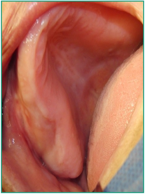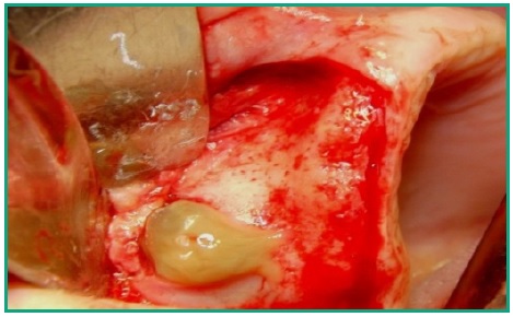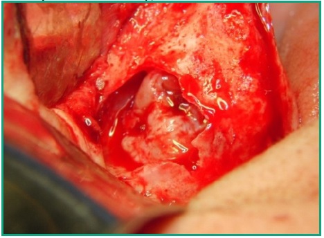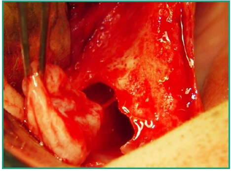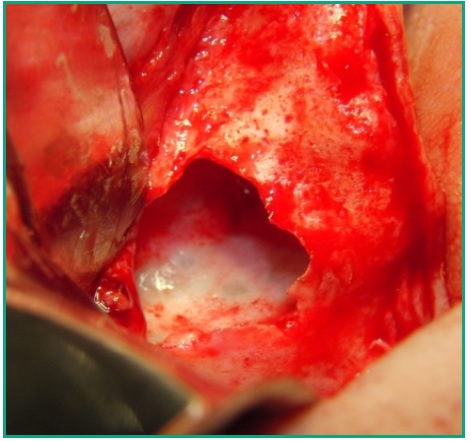 Procedimiento quirúrgico. Mediante la anestesia local correspondiente se procede a realizar una incisión crestal desde la zona tuberosal hasta cerca de la línea media, con una incisión relajante a ese nivel. Previamente a la misma se hizo una punción exploratoria dando como resultado la extracción de un contenido tipo muco purulento. Se elevó un colgajo de espesor total desde adelante hacia atrás, observándose en la zona posterior una fenestración ósea por donde drena abundante contenido mucopurulento (Fig. 6).