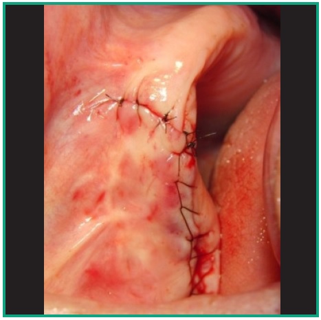 En el post operatorio se indica Amoxicilina 500 mg. cada 8 horas durante 10 días, Ibuprofeno como analgésico y antiinflamatorio a razón de un comprimido de 400 mg. cada 6 horas durante un período de 48 a 72 horas. Como no se realizó contrabertura en el meato inferior se le prescribió gotas nasales con vasoconstrictor para mantener permeable el ostium, facilitando de esa manera el drenaje hasta darle el alta al paciente. A los diez días se retiró la sutura, controlando la evolución cada semana por un período de 2 meses (Fig. 11).
