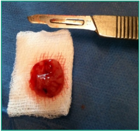 Informe anátomo patológico: Examen Macroscópico: Pieza redondeada de 15x15x4 mm. blanda, blanquecina, al corte contenido sólido gelatinoso amorfo, la membrana externa es fina de 1mm. (Fig. 12).