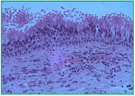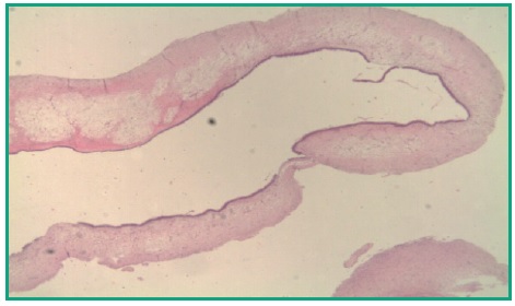 Examen Microscópico: Cavidad quística revestida por membrana fina constituída por epitelio seudoestratificado cilíndrico ciliado (mucosa sinusal), que alterna con zonas de hiperplasia, respaldada por un tejido conectivo fibroso, con zonas edematosas, con abundantes capilares algunos de ellos congestivos y exudados inflamatorios mixtos. El contenido es eosinófilo amorfo con células inflamatorias (linfocitos y plasmocitos) dispersas en un material mucoso (Figs. 13, 14).